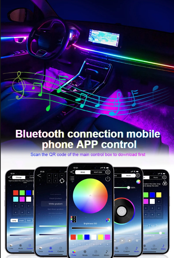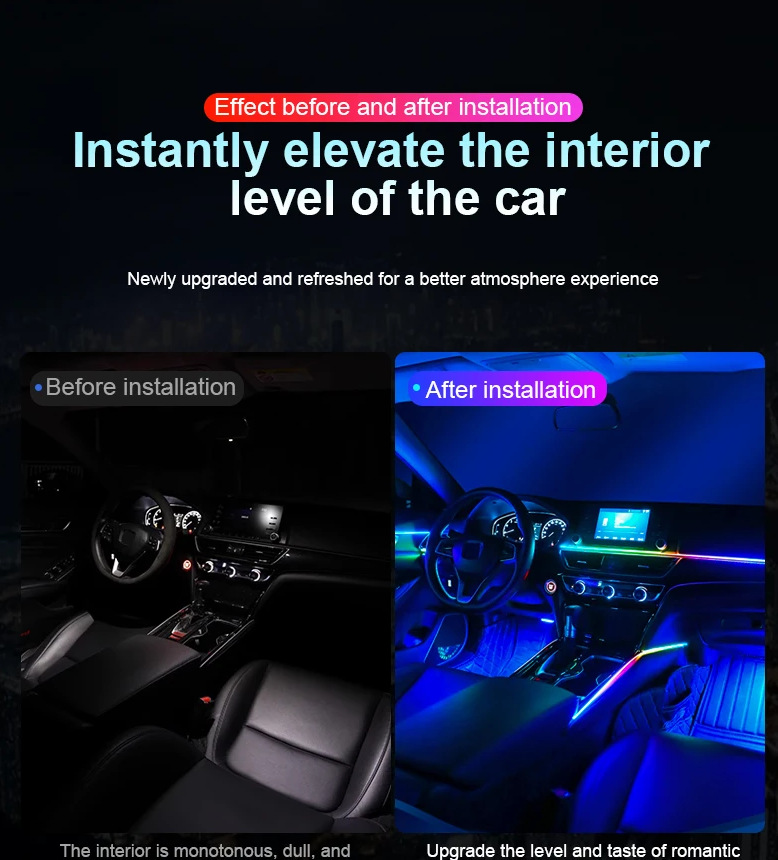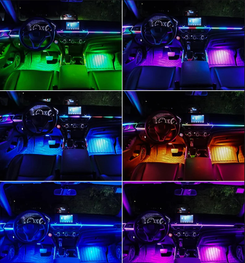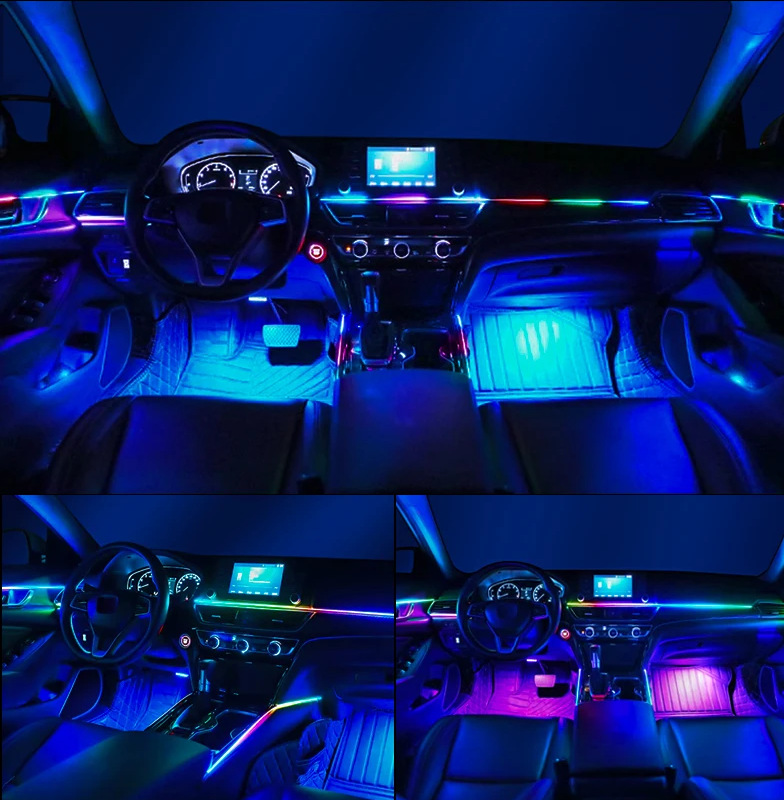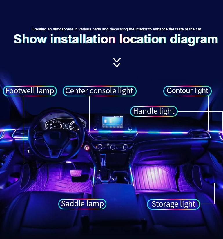 Depending on your selected version, the system can cover door panels, center consoles, underfoot areas, door bowls, and storage compartments for a complete interior transformation. The result is a colorful, immersive space that elevates night driving, enhances comfort, and adds a high-end aesthetic to any car.
